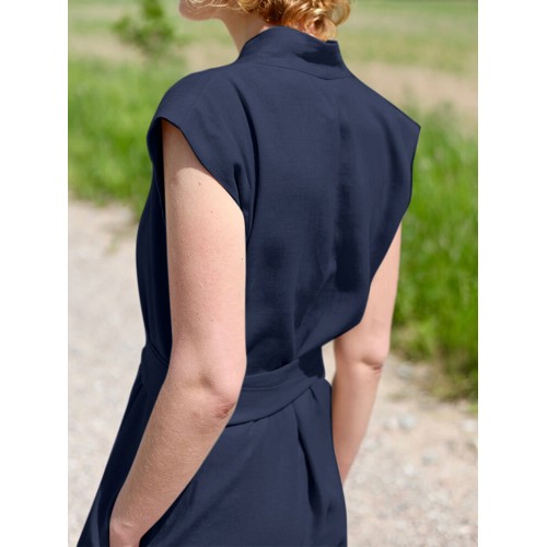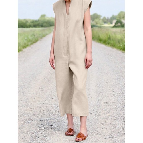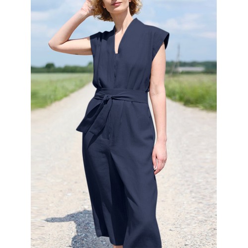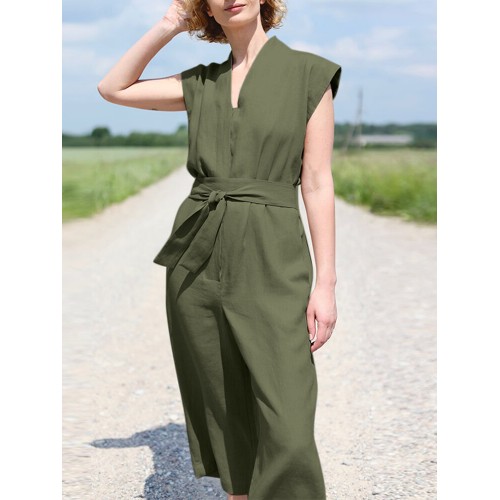 Solid Sash V Neck Pocket Sleeveless Casual Cotton Jumpsuit