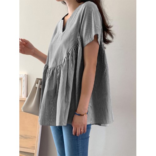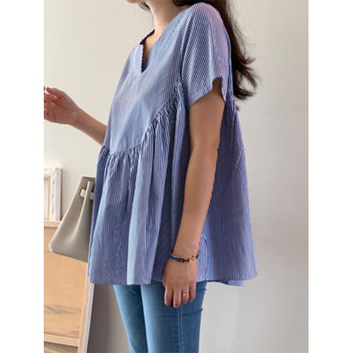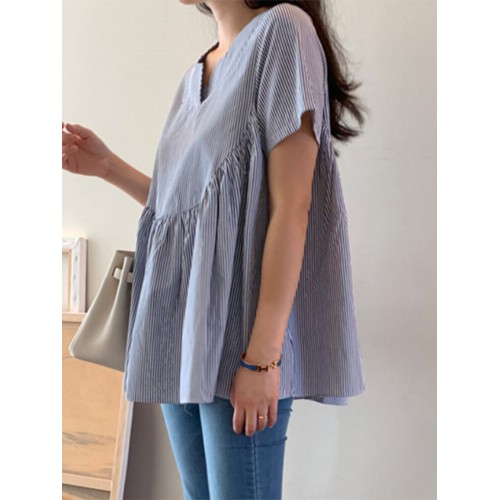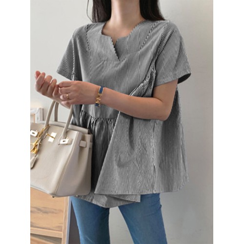 Stripe Print Notch Neck Short Sleeve Loose Blouse