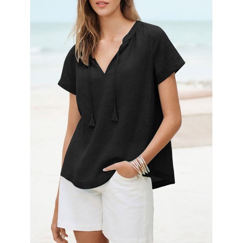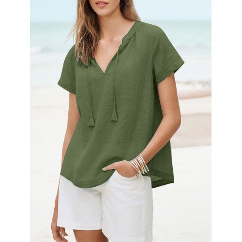 Solid Tassel Knotted V Neck Casual Blouse