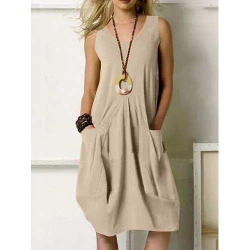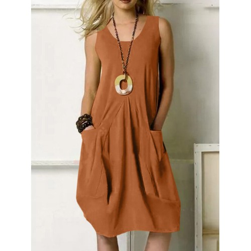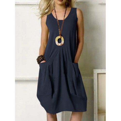Leisure Solid Pocket Zip Sleeveless Cotton Midi Dress