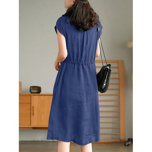 Solid Pocket Drawstring Waist Button V neck Short Sleeve Dress