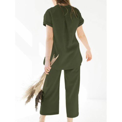Leisure Solid Split Elastic Waist Short Sleeve Cotton Suit
