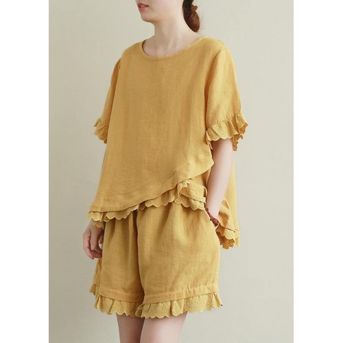 Literary yellow suit lace lace irregular round neck short sleeve shorts two-piece suit