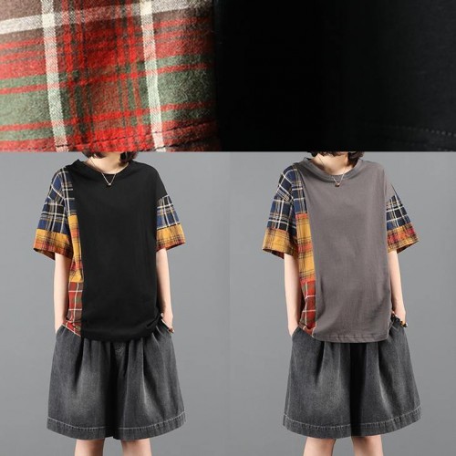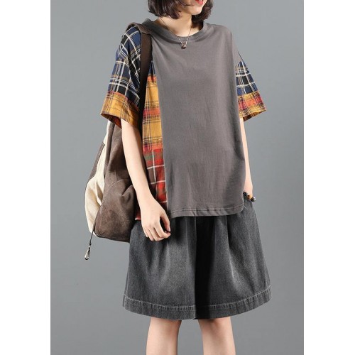 Denim shorts suit women summer loose gray plaid stitching two-piece suit
